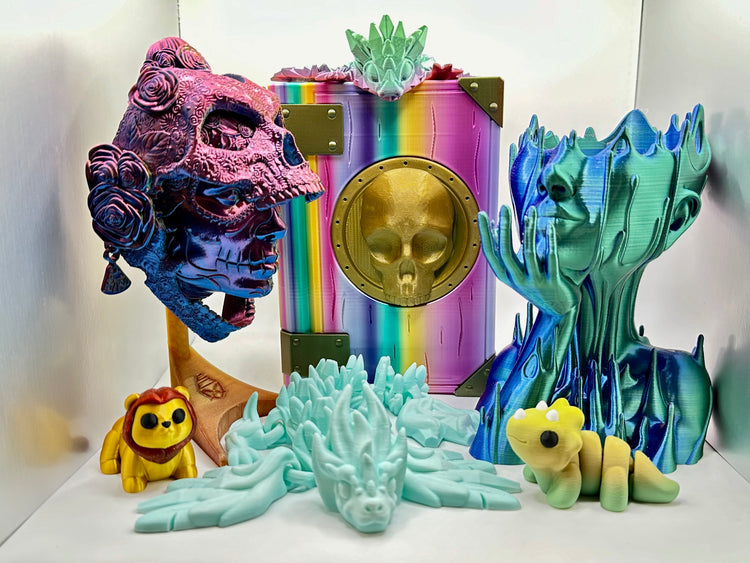 Flexible, articulated, 3D and resin printed figures, fidget toys and keychains.