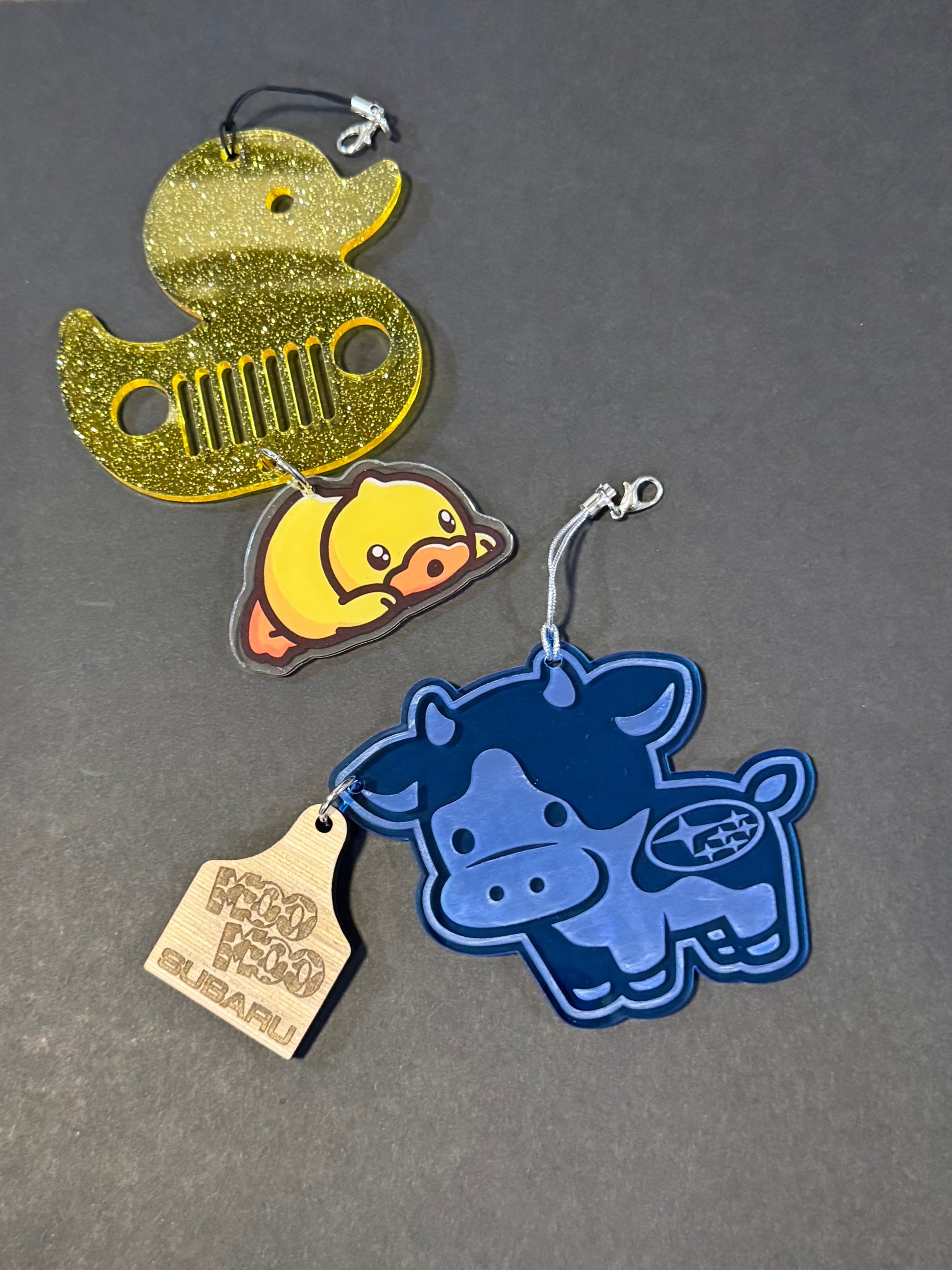 Do you have a Jeep or a Subaru? Have been ducked or moo’d lately? Are you looking for the perfect accessory for your car? We can custom design, cut, engrave, and package any style and design to match your car.